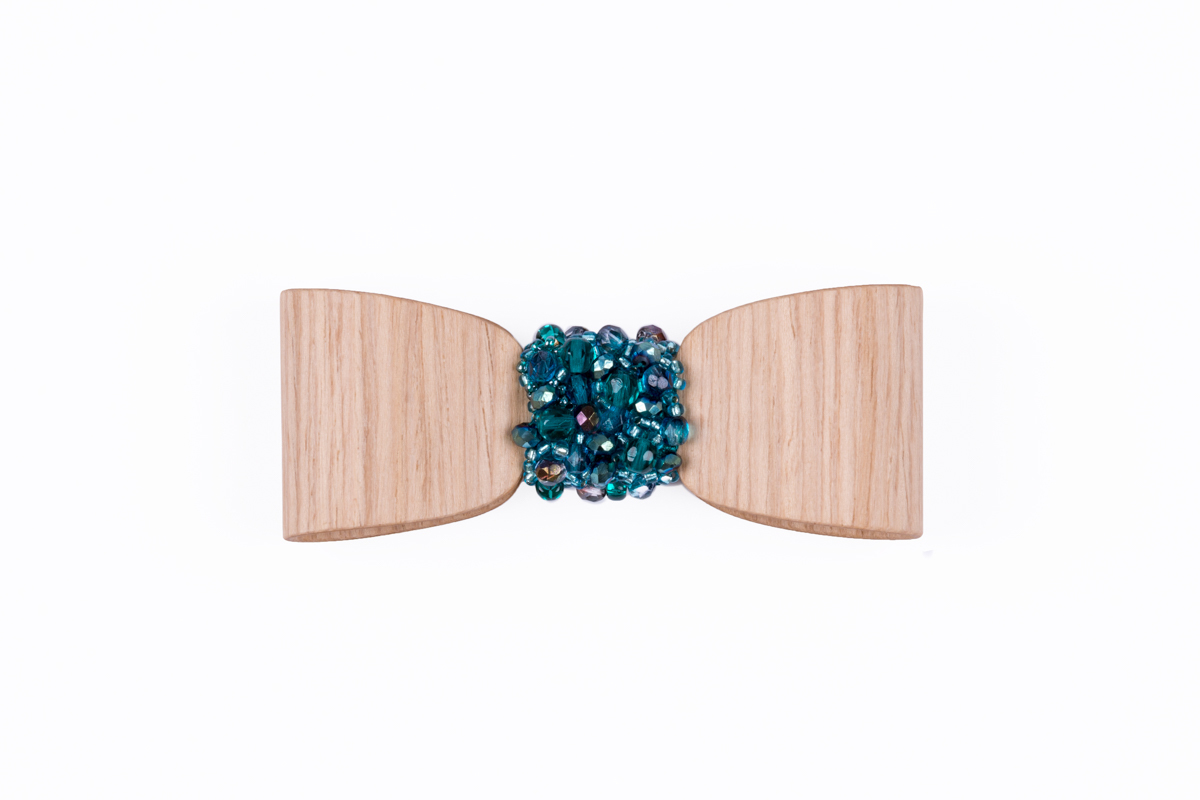 Ainutlaatuinen 3D puinen rintakoru on käsityönä valmistettu naisellinen asuste, jota koristavat yksitellen ommellut helmet ja koristekivet.
