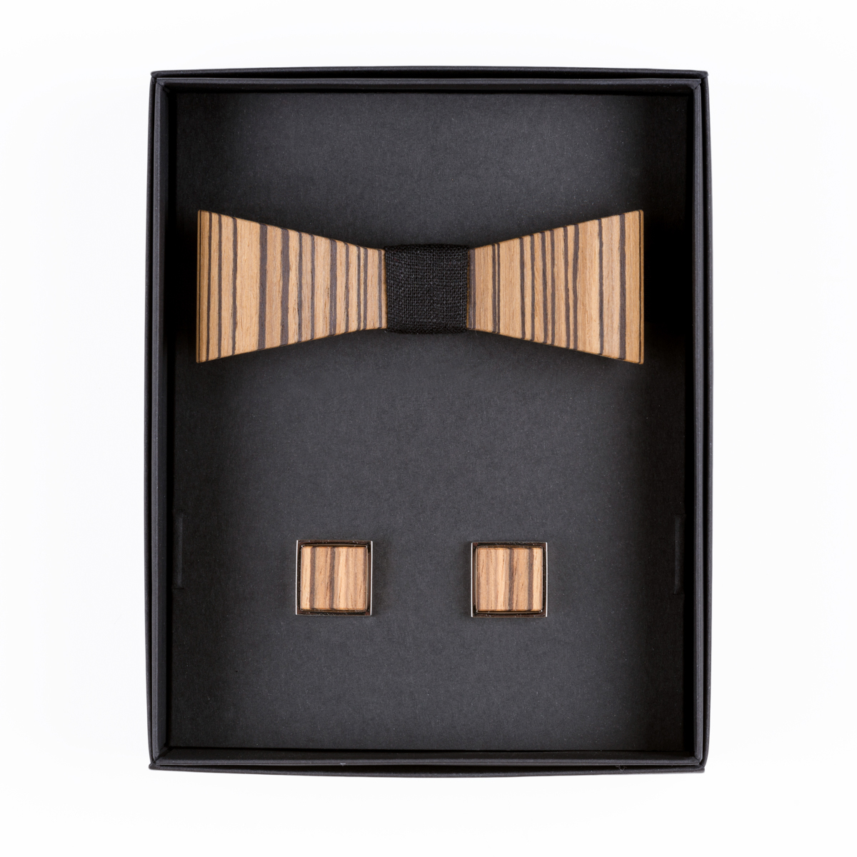 Settiin kuuluvat M-kokoinen käsityönä valmistettu 3D puinen rusetti ja puiset kalvosinnapit.