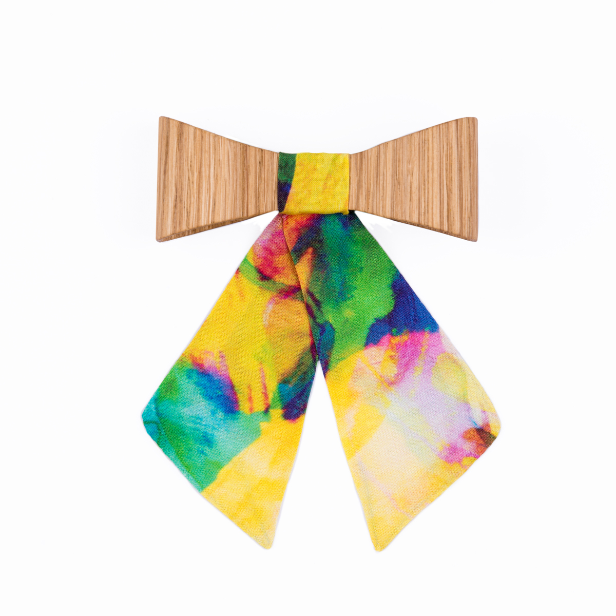 Wooden bow tie with ribbons fits both women and little girls.